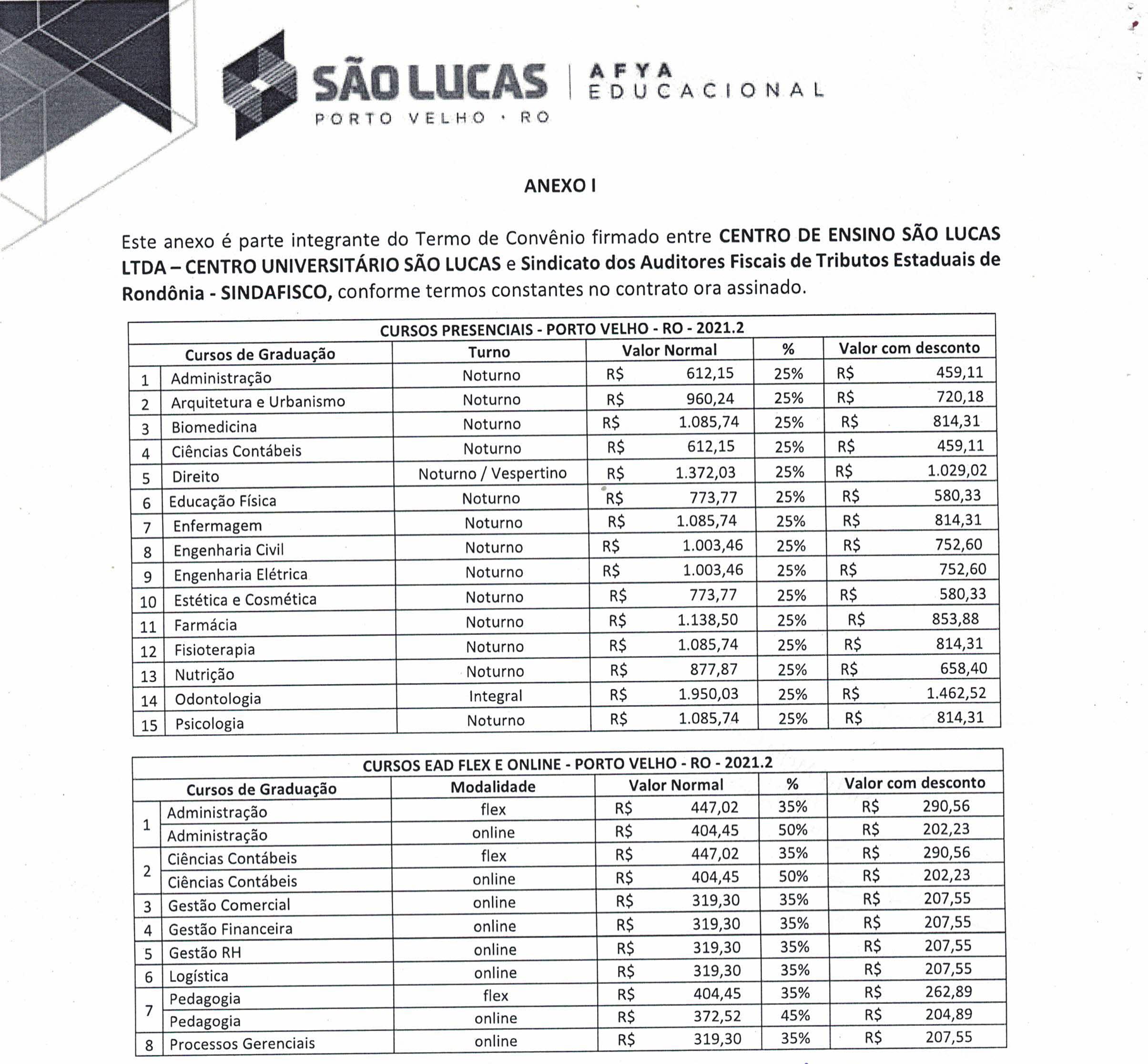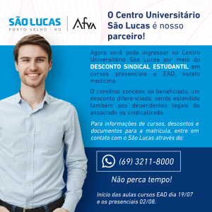 A diretoria do Sindafisco informa que firmou convênio com o Centro Educacional São Lucas para descontos nos cursos oferecidos pela instituição nos modelos de Ensino superior presencial, híbrido (semipresencial) ou online (EAD – Ensino à distância) a partir do Semestre 2021.2.